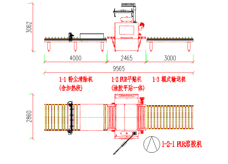 粉塵清除機 — PUR平貼機(含溶膠系統) — 輸送機等部分組成。