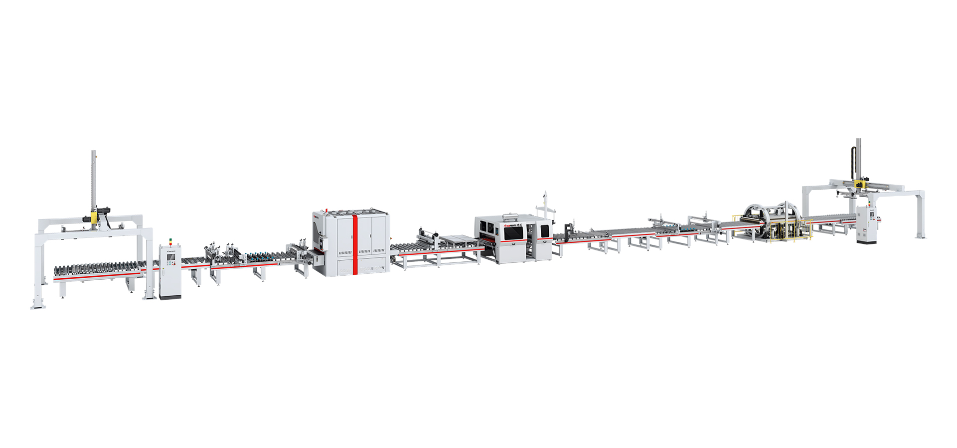本生產(chǎn)線由:龍門上下料機(jī) — 對中輸送機(jī) — 輸送機(jī) — 倒角機(jī) — 砂光機(jī) — 粉塵清除機(jī) — PUR平貼機(jī)(含溶膠系統(tǒng)) — 斜切機(jī) — 輸送機(jī)一精密修邊機(jī) — 輸送機(jī) — 圓筒式翻板機(jī) — 對中輸送機(jī) — 龍門上下料機(jī)等部分組成。