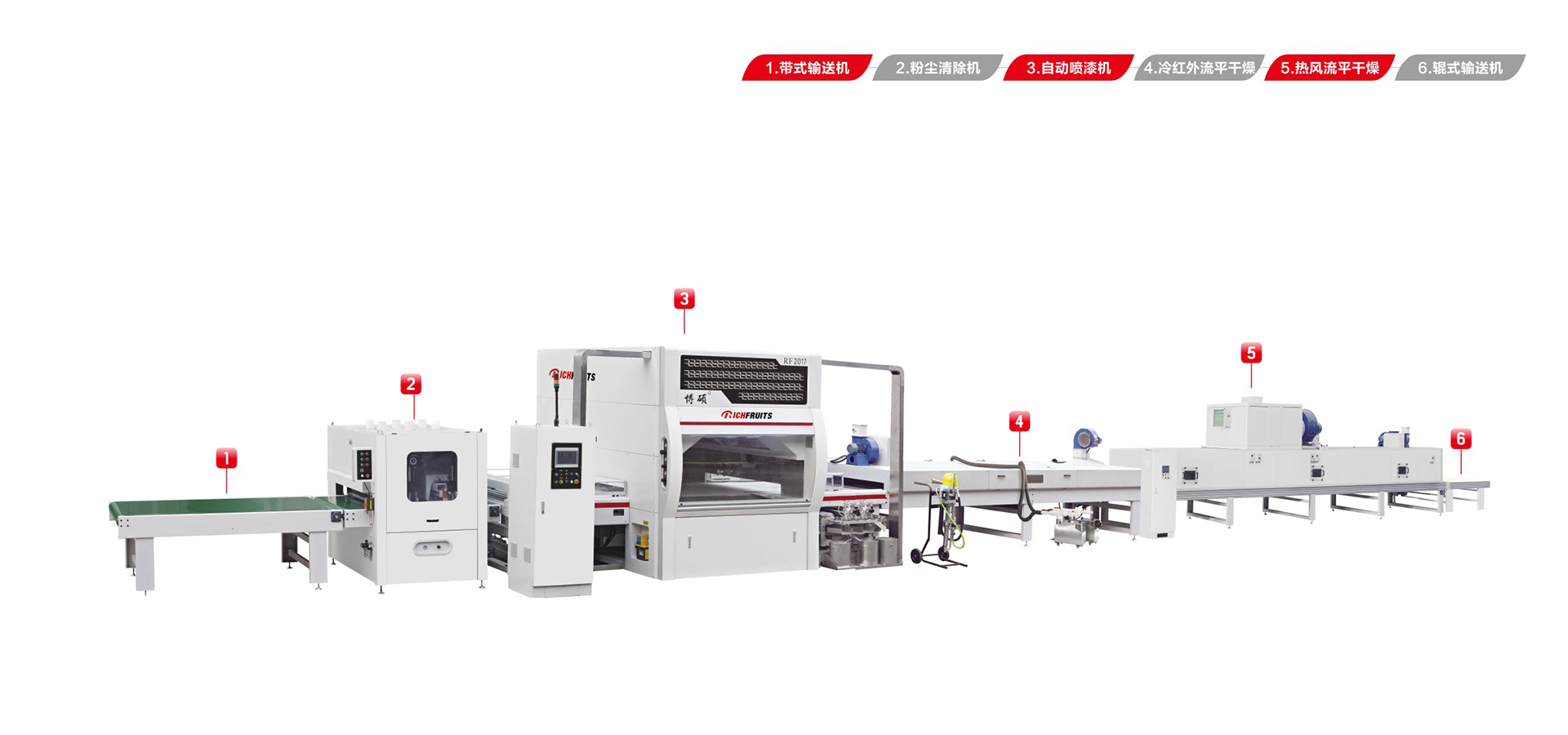 適用于板式家具、實木門、櫥柜門、工藝品、裝飾板、硅酸鈣板、玻鎂板、水泥纖維板的板式加工件的平面和四個側邊進行高質量、大批量連續噴漆。