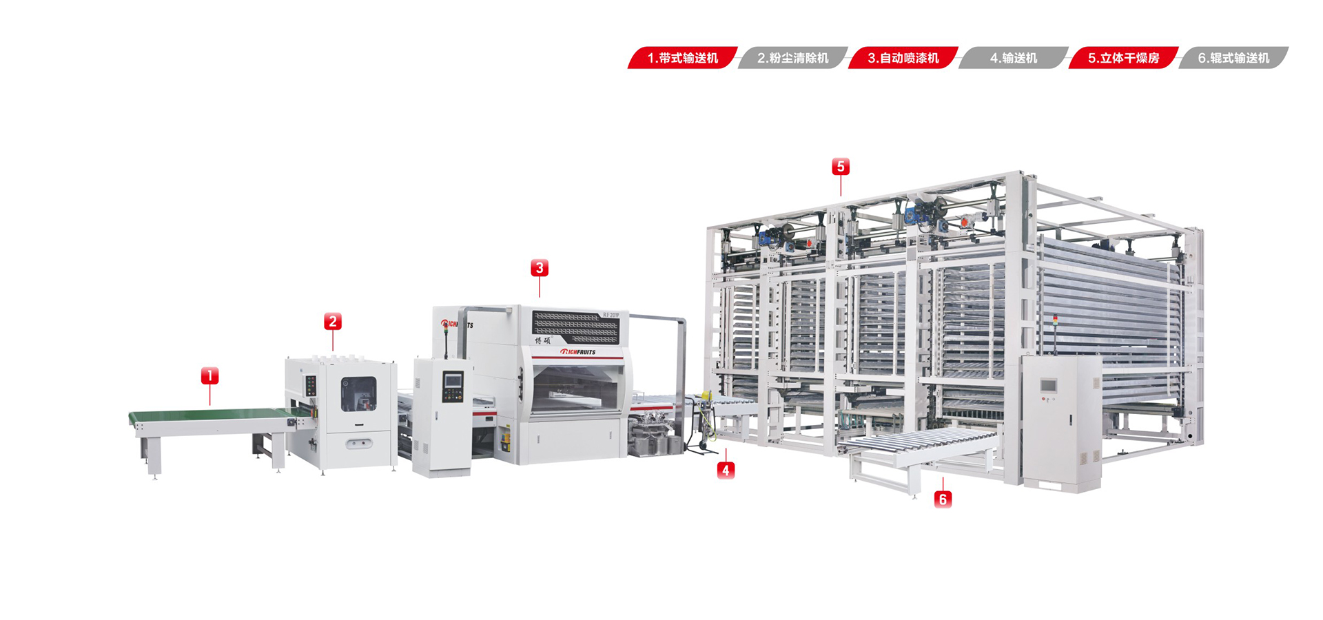 適用于板式家具、實木門、櫥柜門、工藝品、裝飾板、硅酸鈣板、玻鎂板、水泥纖維板的板式加工件的平面和四個側邊進行高質量、大批量連續噴漆。