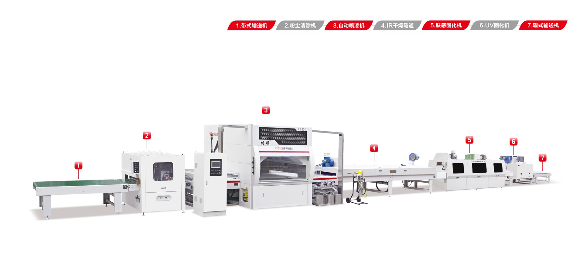 適用于板式家具、實木門、櫥柜門、工藝品、裝飾板、硅酸鈣板、玻鎂板、水泥纖維板的板式加工件的平面和四個側邊進行高質量、大批量連續噴漆。