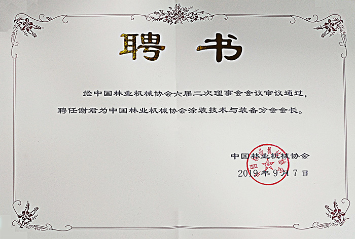 • 林機(jī)協(xié)會(huì)涂裝技術(shù)與裝備分會(huì)會(huì)長(zhǎng)聘書(shū)