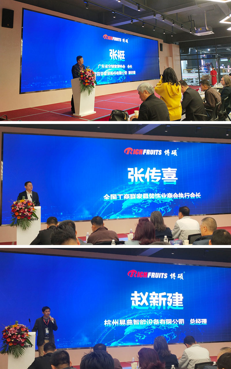 同時,廣東省定制家居協會會長索菲亞副總裁張挺、全國工商聯家具裝飾商會執行會長張傳喜、杭州易典智能設備總經理趙新建都為博碩涂裝一體化智能體驗館點贊!尤其索菲亞副總裁張挺張總高度贊揚了博碩的智能涂裝系統,現國內甚至是全世界最先進的智能涂裝系統落地于蘭考索菲亞工廠。