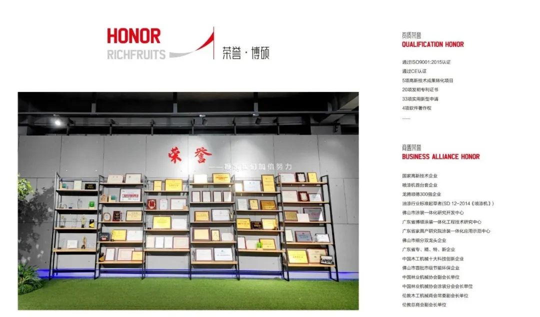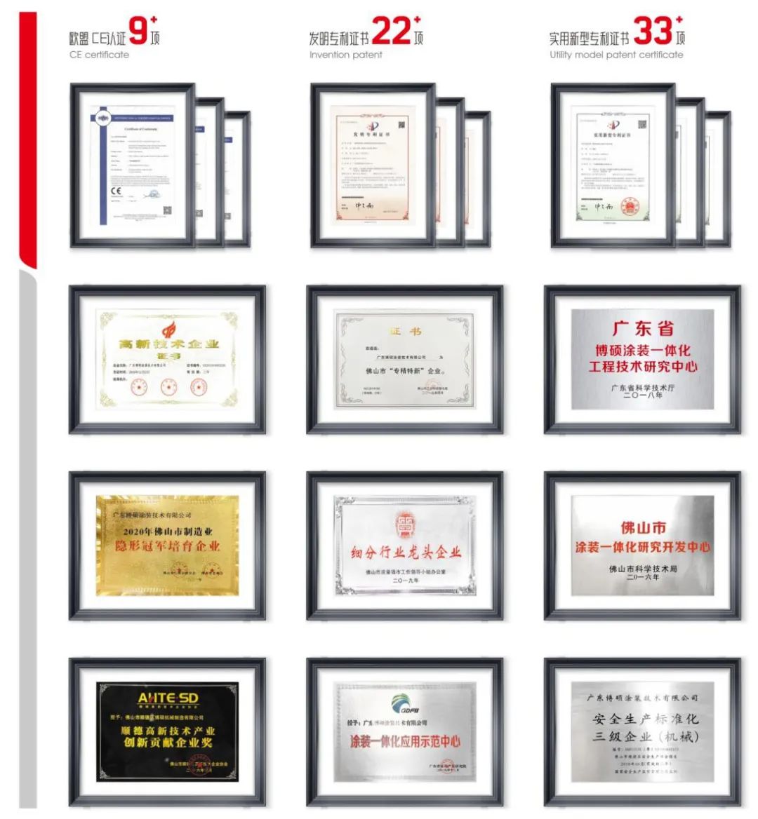 公司在客戶方案的設計方面擁有業界頂級的專家,在研究開發上運用德國、意大利先進的技術平臺,研發制造出滿足木制品和綠色建材行業需求的具有自主知識產權的自動化涂裝生產線,并提供專業的一體化的整體解決方案、技術支持和售后服務。博碩公司已通過SO9001:2015認證、CE認證,是國家高新技術企業,廣東省專、精、特、新,是噴漆機行業標準起草者。