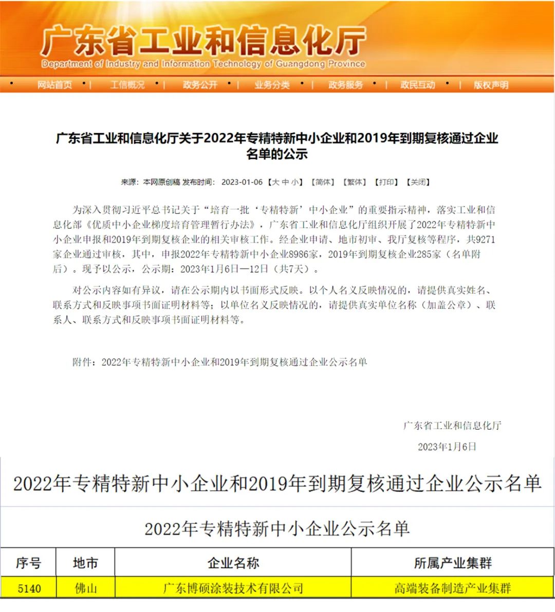 2023年1月6日,廣東省工業和信息化廳發布《關于2022年專精特新中小企業名單的公示》。經過企業自主申報、嚴格審查、專家評選、審核等程序,廣東博碩涂裝技術有限公司正式通過認定入選為:2022年廣東省“專精特新”中小企業