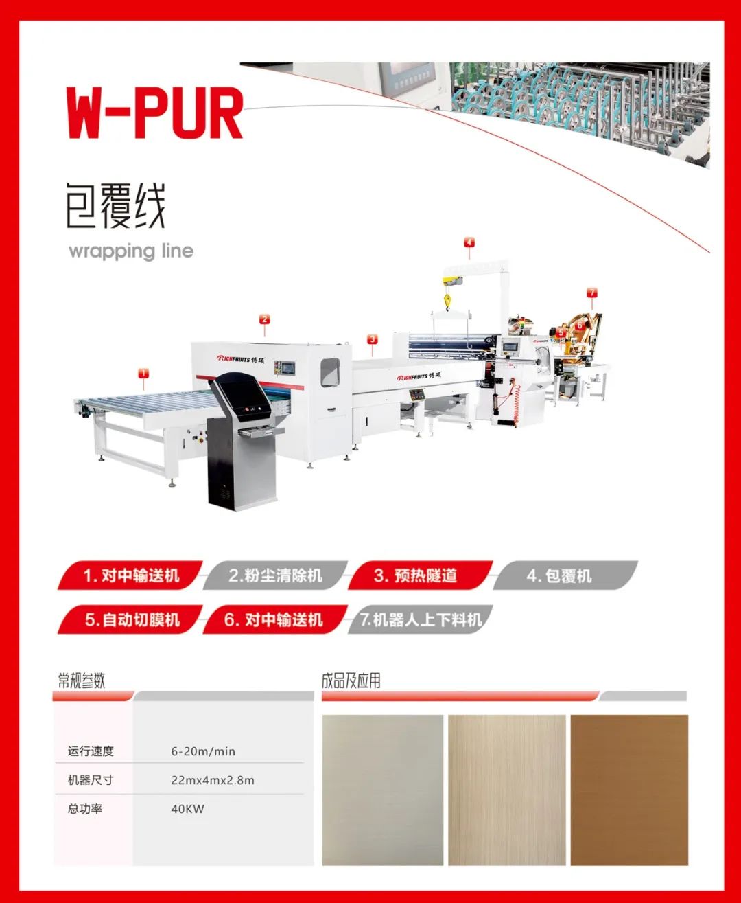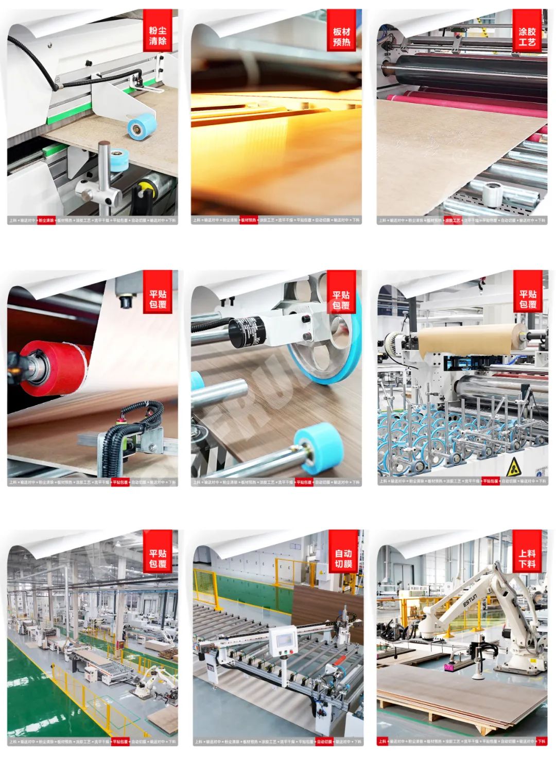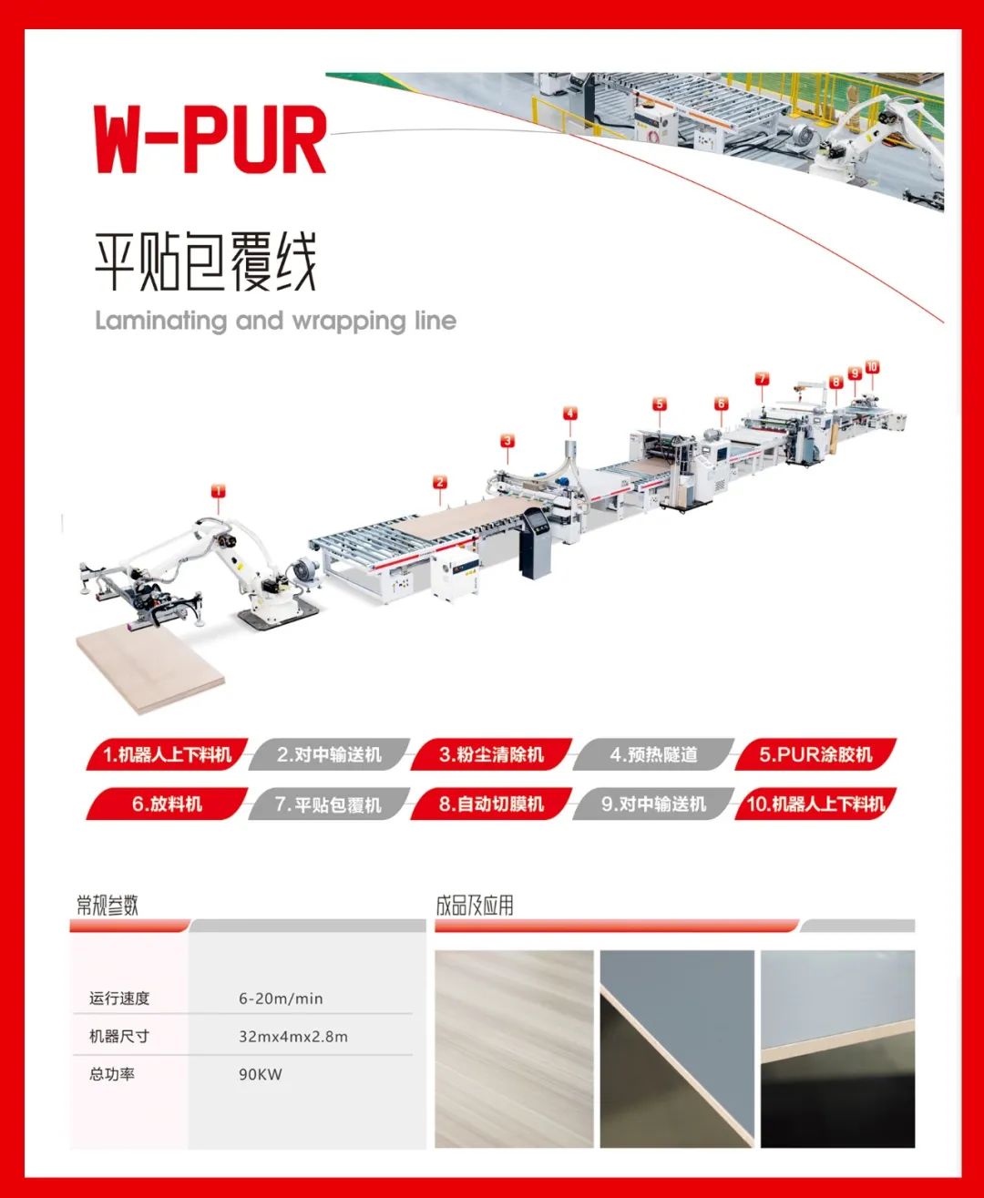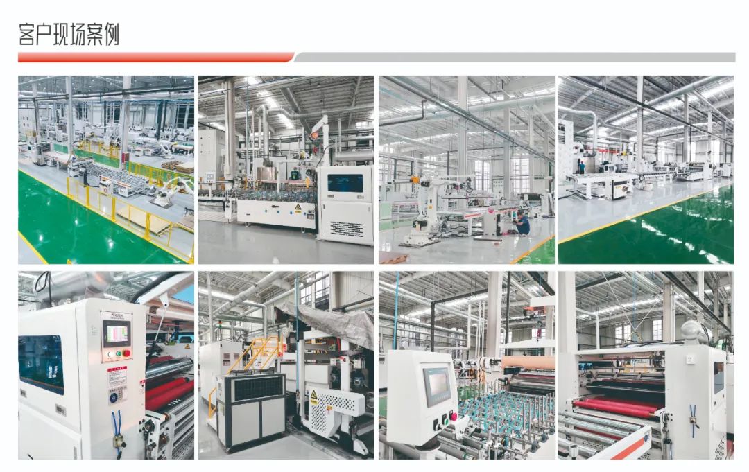 可片材、可卷材混合生產(chǎn)。通用PET、PETG、PP、PVC、CPL、防火板、亞克力、鋁箔、SPC等飾面材,利用PUR膠水均勻平貼或包覆到板材表面。 通用于包覆種類的產(chǎn)品,比如:硅酸板、水泥纖維板、門芯板多層墻板等材料進(jìn)行PUR膠水涂布后包覆各種柔性貼材。