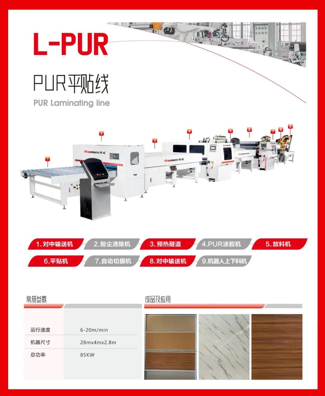 通用于包覆種類的產(chǎn)品,比如:硅酸板、水泥纖維板、門芯板多層墻板等材料進(jìn)行PUR膠水涂布后包覆各種柔性貼材。