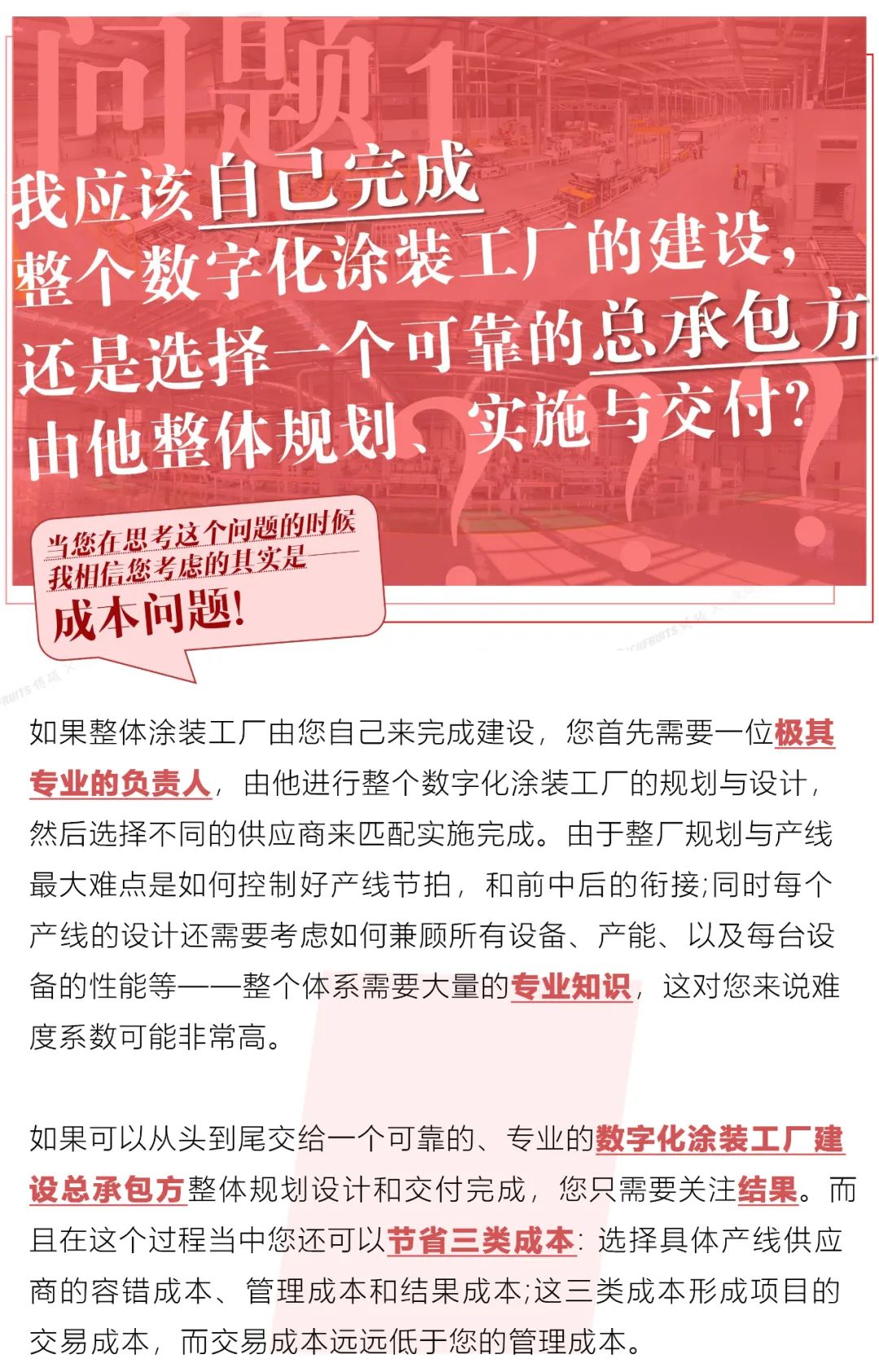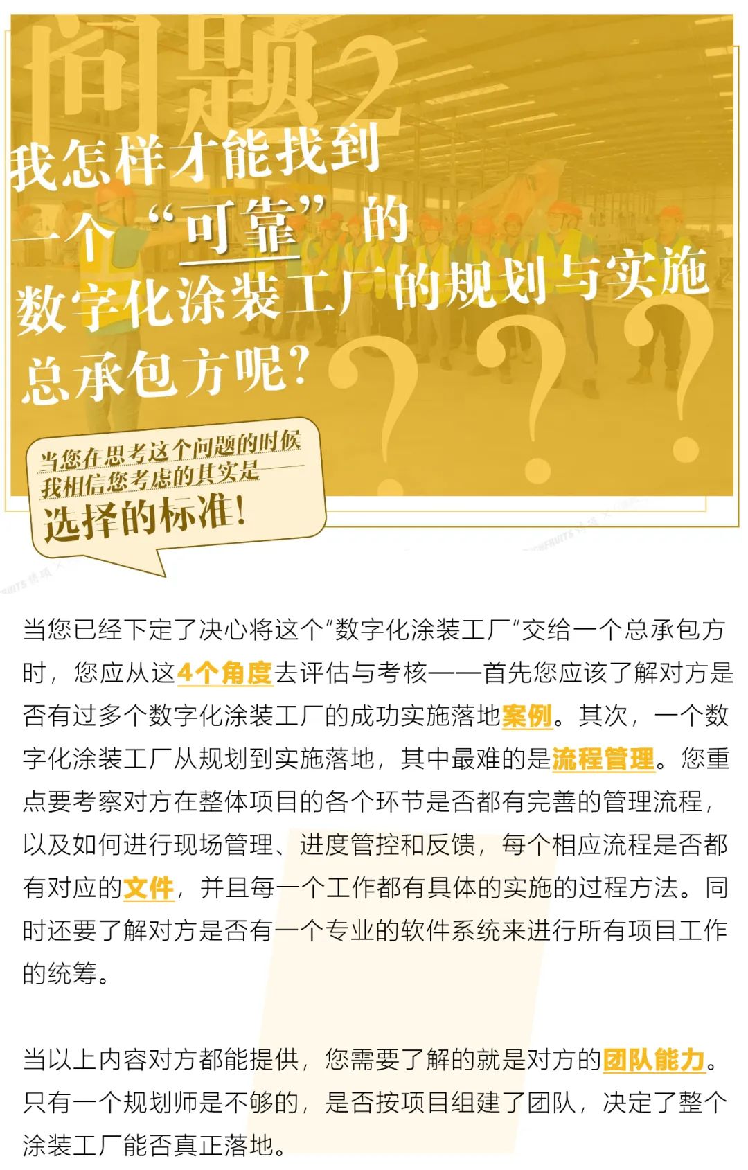 基于多元化材料,以及涂裝工藝本身的專業性,一個投資有效的數字化涂裝工廠和羅馬城一樣,并不容易建,更不是朝夕之間就能建立起來的。那么,有這樣需求的您在考慮上述的需求與解決方式的時候,您一定要從以下5件事先去思考和判斷。
