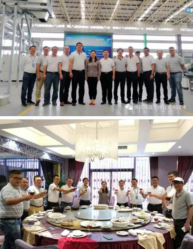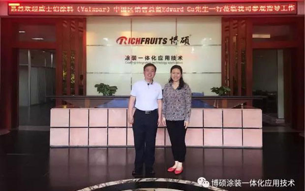 博碩公司由謝總和技術應用的胡博士、市場部的吳總接待士伯涂料(Valspar)中國區銷售總監Edward Gu先生。雙方針對現在市場上的涂料與涂裝設備應用和未來涂料和涂裝設備的產業方向進行深入的探討,各抒己見,同時對未來水性涂料和涂裝設備的對接提出了前曕性的思路。提出了現階段由涂裝設備牽頭完成的自動化和環保化的產業升級改造。未來是有涂料前沿技術的創新和發展驅動整個涂裝產業的發展方向。