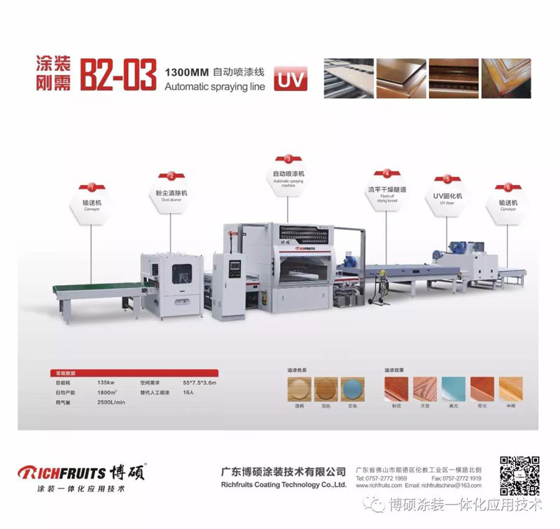 本次展會(huì)博碩攜涂裝剛需:B2-03亮相展位,它具有高效、節(jié)能、環(huán)保的特點(diǎn),采用UV底+水性面或UV底+UV面的自動(dòng)化噴涂工藝,達(dá)到環(huán)保的效果;一條線的管理只需3人,代替16名操作工人;油漆回收利用率達(dá)80%—85%,是傳統(tǒng)手工噴涂的兩倍;適用于櫥柜、木門、實(shí)木、整木等家居領(lǐng)域,日均產(chǎn)能高達(dá)1800平方米。