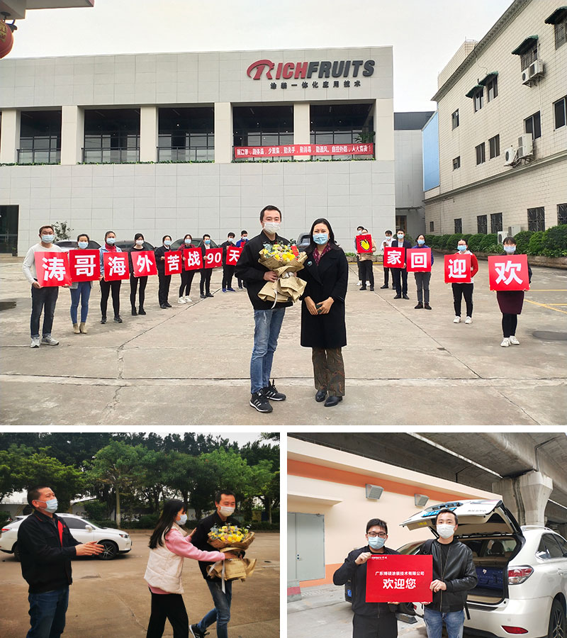 2020年4月7日,博碩用高規(guī)格的禮儀,迎接回了博碩的英雄——趙工。7日下午趙工抵達(dá)廣州南站,公司安排人員和車輛去南站接回趙工,博碩公司董事長謝君帶領(lǐng)博碩的一部分員工,在公司門口手舉歡迎牌夾道歡迎趙工回家,大家親切的稱呼趙工為——濤哥,濤哥在海外苦戰(zhàn)90天后安全回國,并在政府的安排下,隔離期滿后,終于回家了。