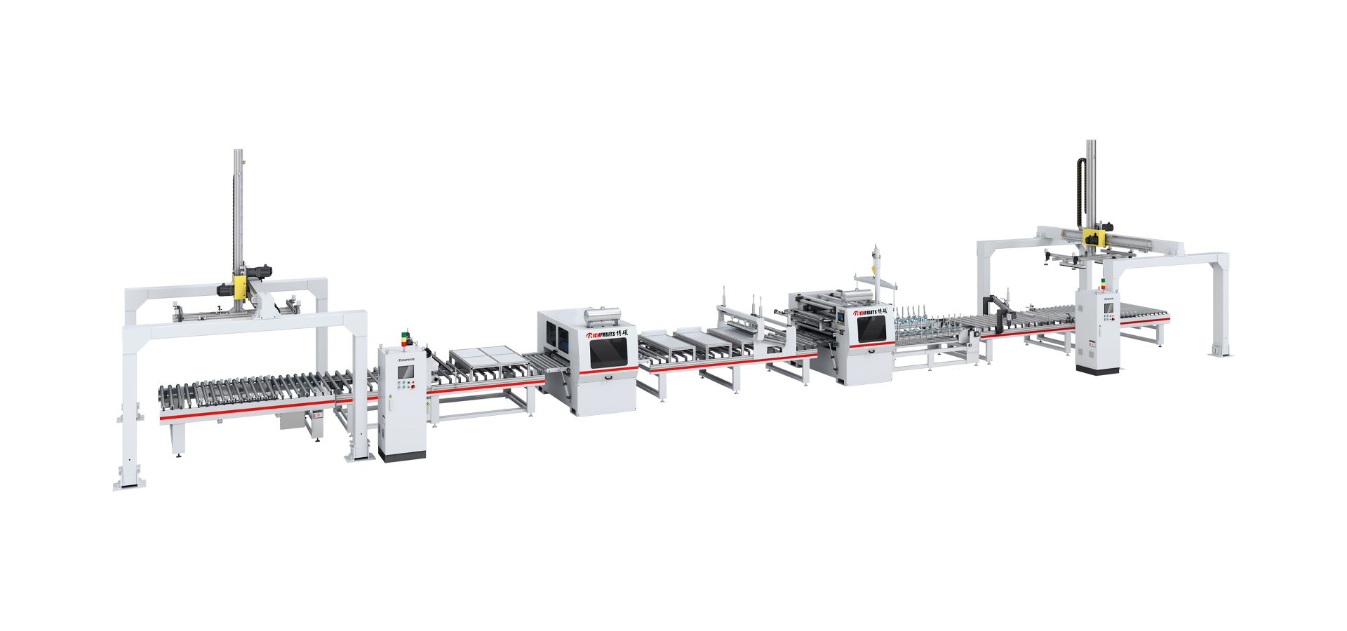 本生產線由:龍門上下料機 — 對中輸送機 — 粉塵清除機 — PUR涂膠機 — 恒溫隧道 — 平貼包覆機 — 斜切機 — 對中輸送機 — 龍門上下料機等部分組成。