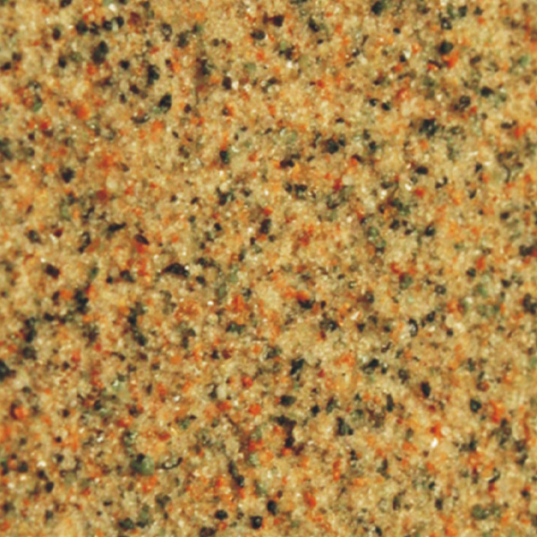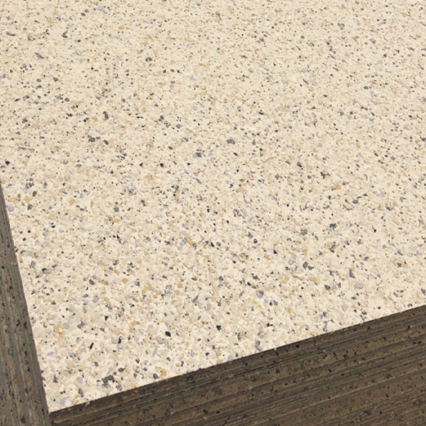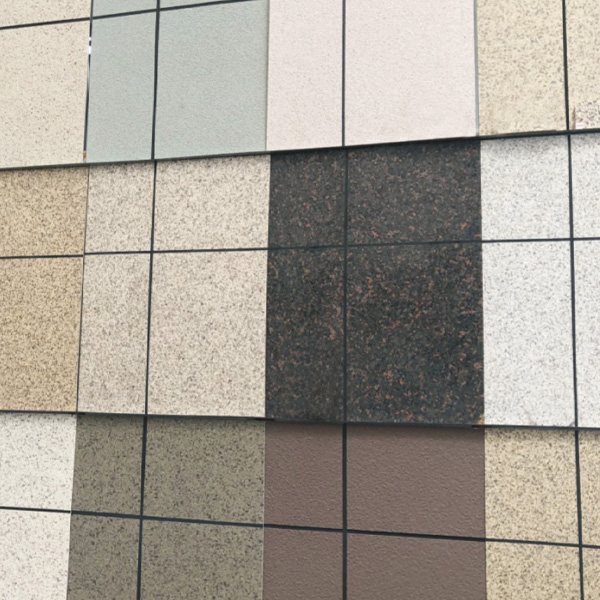 以中高密度纖維水性板/硅酸板為基材,通過砂光和多層水性漆輥涂,以及真石漆/水包砂噴涂,達到仿花崗巖的飾面效果,最后噴涂氟碳罩面,具有良好的自潔性能。真石漆/水包砂噴涂立體浮雕質感面的效果,成本較低,并且具有良好的高低溫效果,非常適用于中低端墻面的裝飾要求。